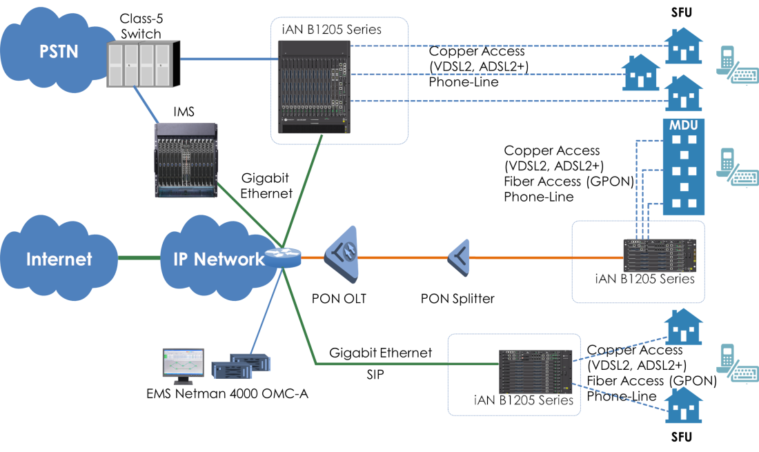 The B1205E supports a range of technologies such as POTS, ADSL/ADSL2/ADSL2+ which allows service providers to serve highly interactive and bandwidth intensive applications. B1205 acts as a traditional TDM based DLC, IPDSLAM, Media Gateway platform integrated into a single device and supports seamless migration from V5/AN to VoIP/AG and IMS Access.