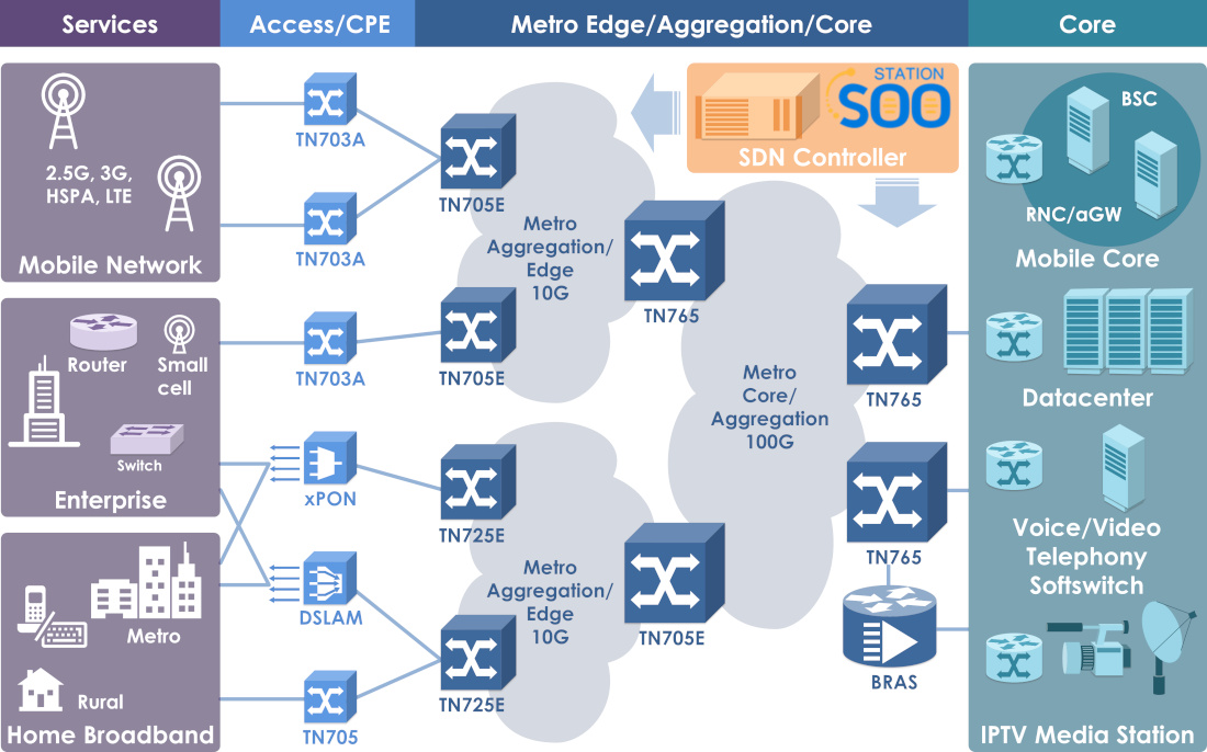 A highly scalable, agile and intelligent metro transport network based on the next generation HW and SW architecture of PTN. The product line offers support of up to 100GE interfaces, SDN-based automation features and advanced services, as well as a broad range of carrier-class features including network-wide time/clock synchronization, carrier class sub 50ms recovery resiliency, guaranteed QoS and SLA enforcement, end-to-end multi-layer OAM. The product line includes a complete line of network elements from access and edge to metro core high-performance devices.