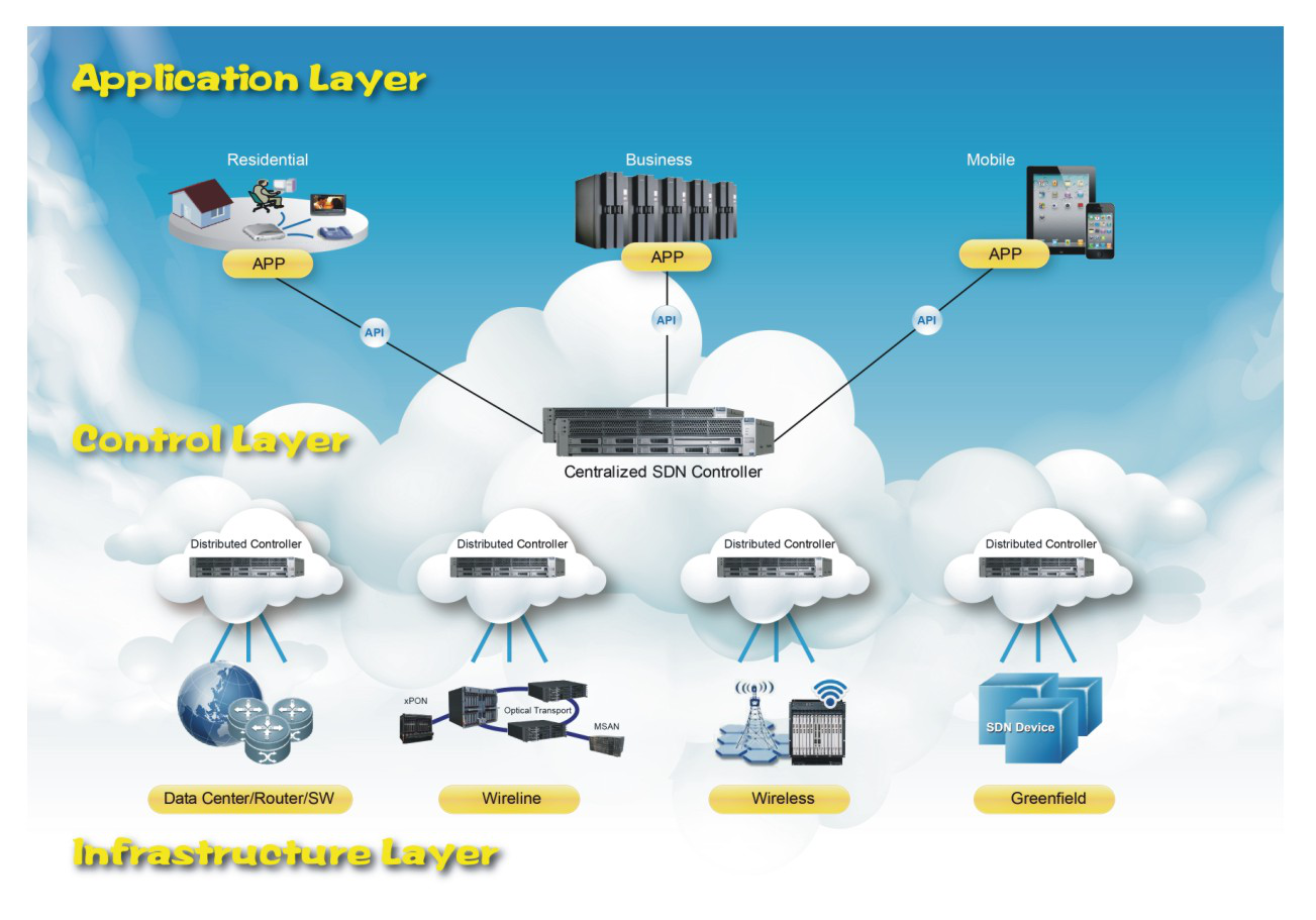 A distributed hierarchical SDN Controller provides a reliable solution for orchestration of abstracted underlying physical network resources, and management of open APIs for vertical integration of applications.